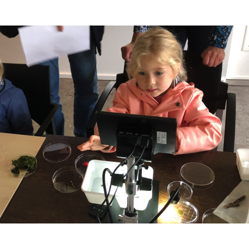 Er staan verschillende microscopen klaar in De Plantage. Sommige om met twee ogen door te kijken, anderen met een groot beeldscherm er aan. Zo lijkt een klein plantenzaadje of de kop van een insect wel een halve meter groot. Een team vrijwilligers staat gereed om je te helpen met scherpstellen of uitleg te geven.