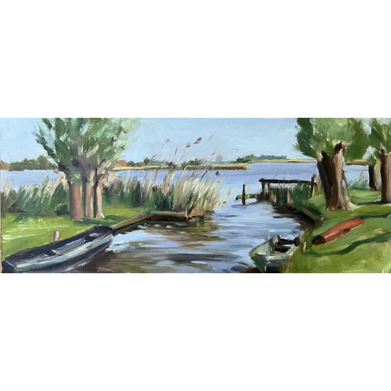 Ik heb geprobeerd dit vast te leggen in mijn werk; willen laten zien wat zij willen behouden. Dit heb ik gedaan door stille plekjes op te zoeken: een klein doorkijkje (een bootje, een slootje) of juist het uitgestrekte van de Brekken met zicht op Doris Mooltsje en de ongerepte skyline. Of het zicht op Sânfurd dat daar zo mooi ligt als je aan komt fietsen. En als het ware oprijst als “Le Mont Saint Michel”, maar dan wat mij betreft vele malen mooier.